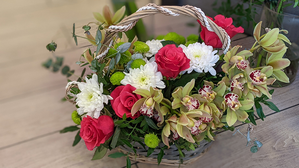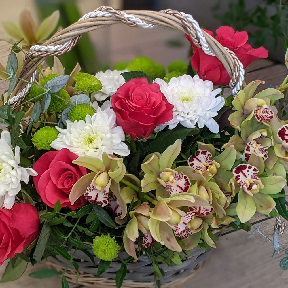 Σύνθεση με βασιλικές ορχιδέες (Συμπίντιουμ), 3 λευκά χρυσάνθεμα, 4 φούξια τριαντάφυλλα, 3 πράσινα σαντίνι χρυσάνθεμα ποικιλία από πρασινάδες και γυψοφύλλη.